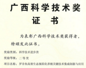 李文红、黄凯教授团队以项目总体设计、指导实施、技术培训和咨询等形式,指导科技富民强县专项行动计划《陆基圆池循环水养殖示范推广项目(鲈鱼)》《罗非鱼等淡水特色品种生态养殖技术集成创新与示范》《集装箱养鱼技术在南宁市美丽南方的应用研究与示范》项目的实施。参加“十四五”广西科技发展规划(水产部分),以及“十三五”广西水产畜牧业发展规划等省级经济发展规划的编制、修改和评审;获实用新型专利1项。黄凯教授团队的成果《罗非鱼高效生态规范化养殖关键技术集成创新与应用》获2018年广西科技进步类奖二等奖。