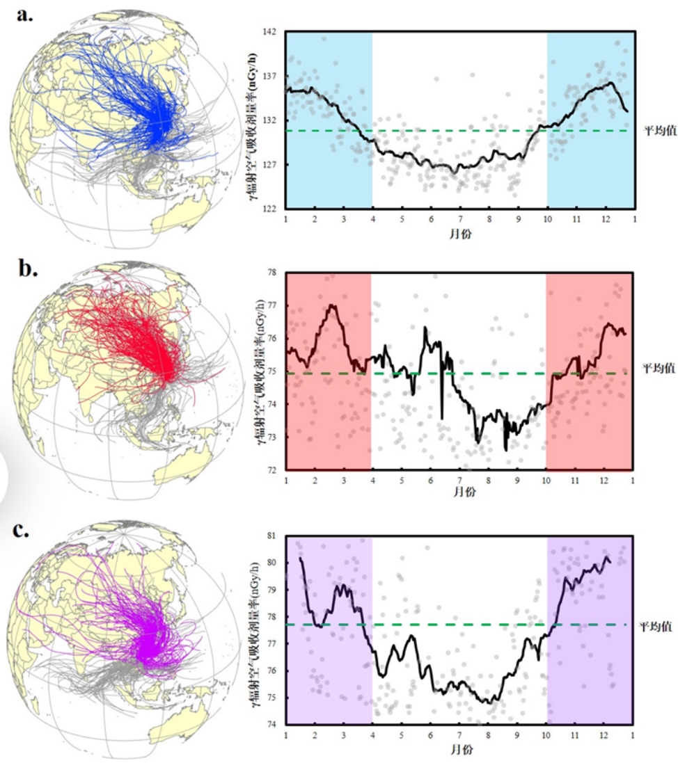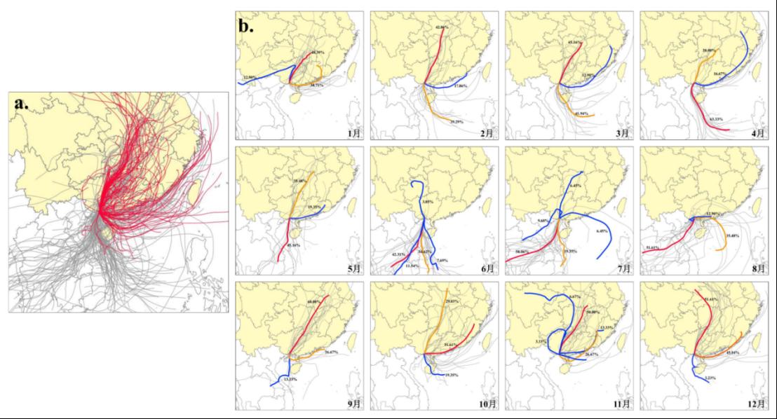 图1 广西防城港核电站的核辐射信号传输轨迹(a)和不同月份的跨区域输运路径(b)