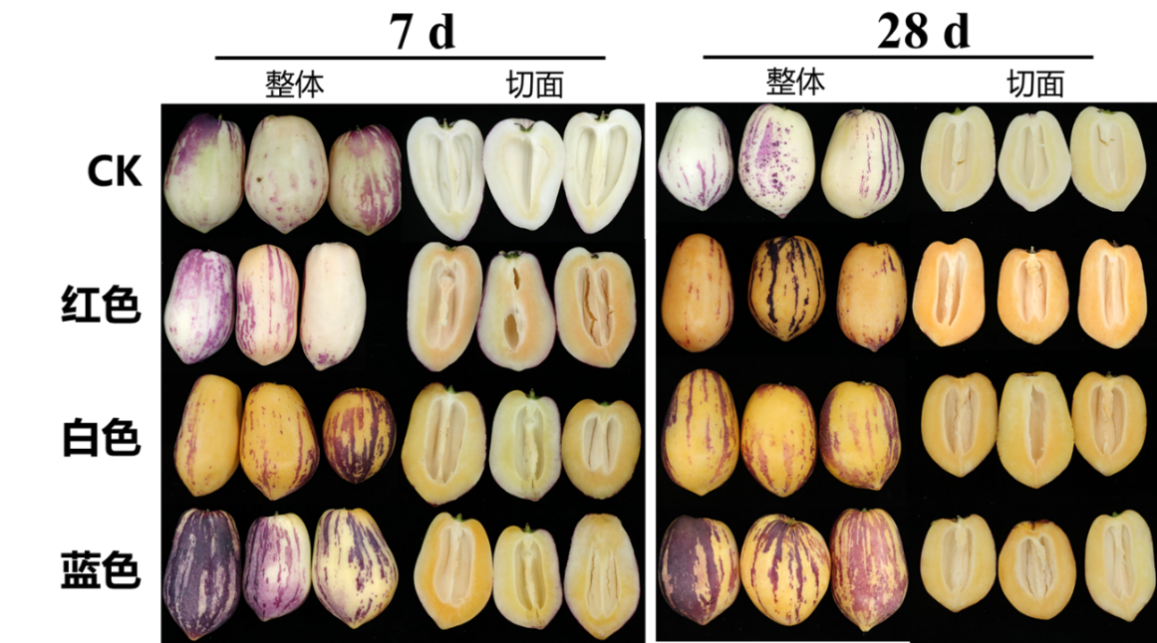 图2 不同颜色LED照射调控采后人参果成熟度作用图。可知红色、白色和蓝色LED处理均可有效调控人参果的采后成熟度