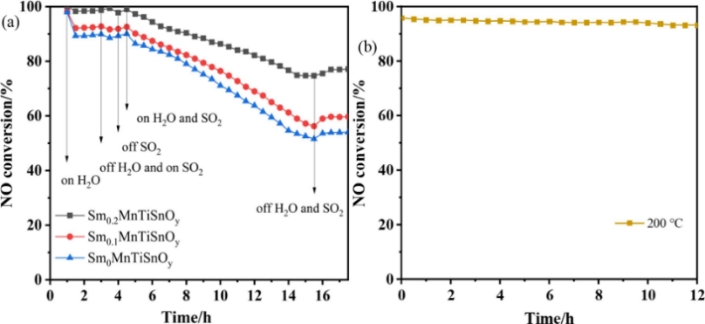 图2 (a) Sm0MnTiSnOy、Sm0.1MnTiSnOy和Sm0.2MnTiSnOy在250 ℃时的抗H2O和SO2 (25 ppm)性能;(b) Sm0.2MnTiSnOy催化剂在200 ℃下随时间变化稳定性试验