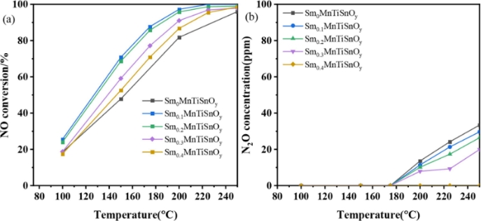 图1 (a) SmxMnTiSnOy在NH3+NO+O2反应过程中NO转化随温度的变化;(b) SmxMnTiSnOy催化剂在不同温度下的N2O浓度。