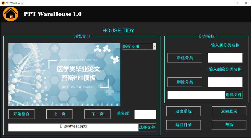 PPTWareHouse软件可实现PPT模板的分拣、查重、归类和取用等功能,可根据用户自身的需要建立和删除多种分类,对导入的PPT模板实现批量的分拣并检查重复度,待要使用时可从软件内直接提取,以提高PPT使用者的工作效率。软件运作过程包含美学设计内容,能够在科研汇报等活动中帮助科研工作者更生动、更具艺术性地表达自己的工作内容。