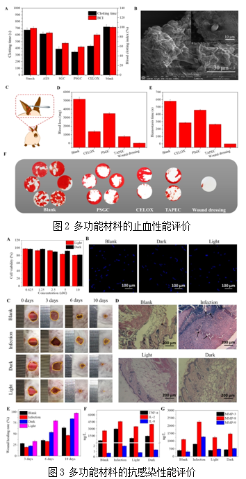 针对上述问题,本课题组制备了一种多功能伤口敷料,其集快速止血、细菌感染检测以及原位光动力抗菌治疗于一体,可智能干预伤口治疗的全过程。材料按与创面接触由内而外分为止血抑菌层,粘附层,检测层,抑菌层,其中粘附层可粘附皮肤防止血液外流,而止血抑菌层可快速吸收血液水分促使血小板浓度增大,进一步提高了凝血效果;检测层通过负载报告分子,使其具备对细菌感染检测响应的能力,其原理是报告分子与致病菌分泌的酶发生反应生成荧光分子;负载了光敏剂的防护层可对细菌灭活。该多功能材料从创口止血到创口愈合可进行全程干预,避免了细菌的侵入感染,同时避免了反复更换敷料对创口造成的二次损伤,最大程度保障了患者的生命安全。