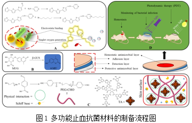 在大多数的意外事故中,失血过多和伤口感染是导致伤者死亡的主要原因。目前市场上的止血材料存在很多不足,其功能单一,一方面其无法在快速止血的同时防止细菌感染,这增加了患者因感染而死亡的风险;另一方面其无法在后续创口愈合过程中及时对细菌侵入感染进行响应报告,并在不反复更换伤口敷料的情况下原位抗菌,这对创口愈合是极大的隐患,原位抗菌意味着不用更换止血材料,极大地避免了创口的二次损伤,对创口愈合有极大的促进作用。因此医疗卫生领域对集快速止血、细菌感染响应、原位抗菌的多功能医用材料是迫切需求的。