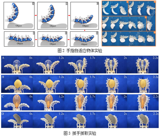 此类抓手是一种面向易碎、易变形物体或动物活体抓取或抓持任务的理想的机械式抓手,我们已在公开发表的论文中将其定义为“GXU-Grasper”,该抓手同时具备以下优点:(1)手指能自适应其有效工作空间内任意轮廓形状的物体(不需要任何传感技术反馈控制,具有软体抓手特征),可满足机器人抓手多样化操作需求;(2)无论手指有多少段指节(指节单元)组成,抓手手指自由度为一;(3)各手指抓持力绝对均匀,并且抓持力理论上只取决于安装于每个指节单元内的弹簧弹性系数;(4)与软体抓手不同,该仿“软体”机械式自适应抓手结构为全刚体机械式结构,承载能力强;(5)抓手可有效抓取易碎易变形物体,亦可无创抓取动物活体;(6)抓手可制作成更小尺寸,抓取细小物体(或活体生物),亦可将抓手制作成更大尺寸,实现任意环境下任意物体或装备的均匀、牢固抓持。