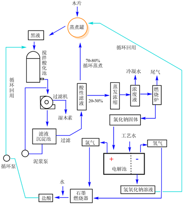 本成果的工艺流程:利用盐酸替代硫酸进行黑液酸化提取木质素,产生的大多数酸性滤液(70-80%)用于新木片的循环蒸煮,剩余的少部分(20-30%)的酸性滤液经过蒸发浓缩和燃烧,获得氯化钠固体,然后,按照常规的氯碱工业电解生产工艺,电解食盐饱和溶液,获得氢氧化钠、氢气和氯气,继而,让氯气和氢气燃烧反应,生产浓盐酸。电解产生的氢氧化钠溶液和燃烧产生的浓盐酸,在该制浆系统内部循环利用。