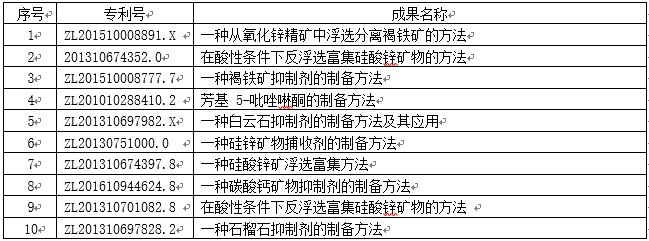 基于不同 pH 值和浓度下矿物和调整剂之间的溶液化学特性,发明了非目的矿物选择性抑制的溶液化学调控方法,成功解决了氧化锌矿中褐铁矿、碳酸钙矿、白云石、石榴石等脉石矿物的高效抑制及分步调控问题;针对不同金属氧化矿物晶体化学与表面特性差异,发明了矿物表面结构与药剂分子相匹配的 O-O 及 O-N 型螯合捕收剂设计方法与组合捕收剂的组装技术,解决了氧化锌矿的浮选捕收选择性问题;发明了矿物颗粒间作用的分散与聚集调控方法,开发了基于高效抑制-分步调控的氧化锌矿快速浮选新技术,突破了微细泥氧化锌矿物夹杂互含的浮选分离技术瓶颈,实现了氧化锌矿物的高效回收。