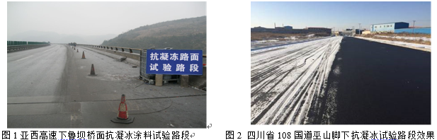 生物抗冻蛋白乳化沥青材料在亚西高速下鲁坝桥面、四川省108国道巫山脚下、广西南(丹)天(峨)高速公路建设项目、平(塘)天(峨)高速公路建设项目(广西段)、广西天(峨)巴(马)高速公路建设项目和广西河(池)百(色)高速公路建设项目上铺设了试验路段,抗凝冰涂料抗凝冰效果显著,能大幅度提升公路路面性能,大幅度减少路面凝冰的产生,减少交通事故的发生,保障行车安全。