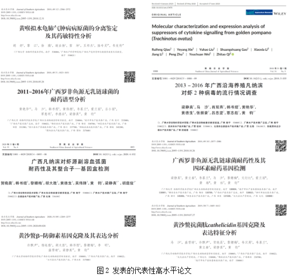 梁静真讲师所在团队利用beat365手机版官网入口水产学科平台与广西壮族自治区水产技术推广站组建了广西水生动物病害诊断实验室。该实验室每年承担广西壮族自治区水产畜牧兽医局《水产养殖动物病情测报》专项项目,对广西13个市19个县(区)进行水产养殖动物病害监测,并根据监测结果第一时间服务生产一线。2018年至2021年,共采集水产动物病样1100多个,分离鉴定并保存病原菌1250多株,对其中468 株进行了药敏试验,并根据药敏试验结果与广西各级水产技术推广站联合,以实时对点的方式先后指导了340个养殖户开展水产动物病害防控工作,收到良好效果。成果《淡水养殖鱼类疾病诊断及防治技术应用推广》获2018年广西农牧渔业丰收奖优秀奖。