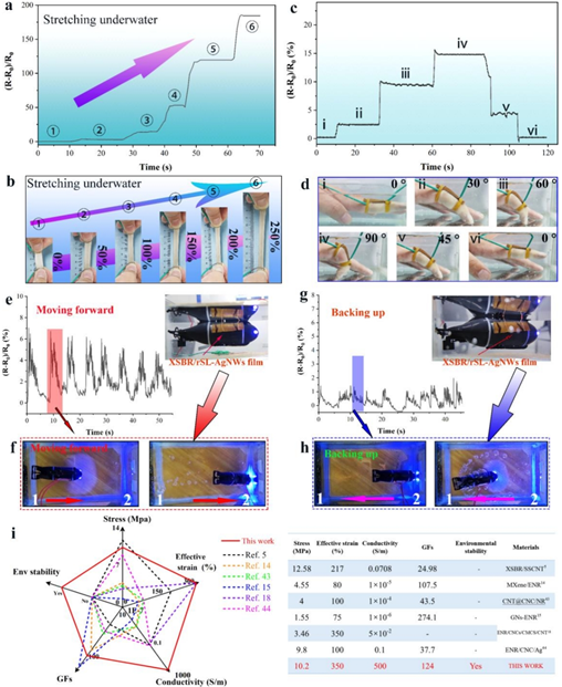 受人体皮肤的毛孔收缩和多层结构的启发,研究团队设计了一种具有集成层状结构的羧基丁苯橡胶/再生木质素磺酸钠-银纳米线(XSBR/rSL-AgNWs)复合薄膜。该薄膜由超高导电性的AgNWs富集层(500 S/m, AgNWs含量仅为5 wt%),rSL隔离网络层(提供10.2 MPa的应力),以及具有防水性能的致密橡胶层组成。这种独特的集成层状结构,使薄膜在少量填料的情况下,在水中具有稳定的导电性,灵敏度为110 ms,测量因子为145.8,响应应变范围为0.5%至350%。这些优异的传感特性使复合薄膜能够在复杂环境中监测运动、脉冲和语音信号,从而为柔性电子器件的开发提供了新的途径。