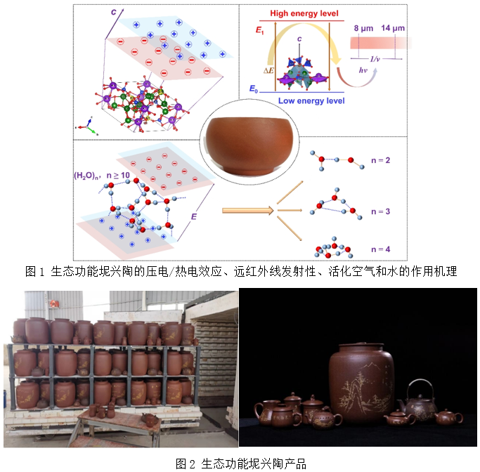 广西钦州坭兴陶被称为我国“四大名陶”之一,独具透气而不透水的天然双重气孔结构,被广泛应用于食物保鲜、养水、泡茶、煮茶、煲汤、熬药等,比一般陶器具有更好的使用效果。beat365手机版官网入口广西特聘专家“天然高分子与生态功能材料”科研团队通过研究证实了传统坭兴陶具有一定的生态功能(但功能不强且不稳定),并揭示了坭兴陶具有生态功能的机理及坭兴陶泥料的独特性。为了提升钦州坭兴陶这一非物质文化遗产的产品性能,团队从古埃及金字塔之谜和海洋生物矿化中得到启发,张燕娟副教授主持研发了“机械活化协同生物矿化制备生态功能坭兴陶技术”,使坭兴陶的特殊功能得到强化,并在企业建立研发生产基地。采用自主研发的机械活化固相反应体系(获2017年度广西自然科学奖二等奖)对矿泥原料进行活化,改变矿物组分的晶型结构,形成无定型结构和晶格缺陷使其活化,并同时激活有机质。然后将活化的矿物泥料进行生物矿化以重整其物相和晶型结构,在生物矿化器中以有机质为模板剂,通过控制湿度、温度等因素调控矿化生成特定多面体晶型结构的硅酸盐,在高温烧制过程中通过高温固化、类质同象发育作用形成P63空间群无对称中心的环状结构硅酸盐矿物相,使成品坭兴陶器具有自发极化性、热释电性、压电性、发射远红外线等特殊性能。生态功能坭兴陶的自发极化效应可产生永久电极和表面电场,在温度和压力微弱变化时,晶体两端存在的电势差使周围空气发生电离,被击中的电子附着于邻近的水和氧分子使它们转化为空气负离子;坭兴陶盛水时使其周围的水分子发生解离并改变水的氧化还原状态,水为酸性时被还原放出氢气,水为碱性时被氧化放出氧气,进而调节水的pH值;坭兴陶的远红外辐射性可发射远红外线,与水分子产生共振,打断缔合水分子间的氢键,使水分子团簇变小,形成小分子团水。