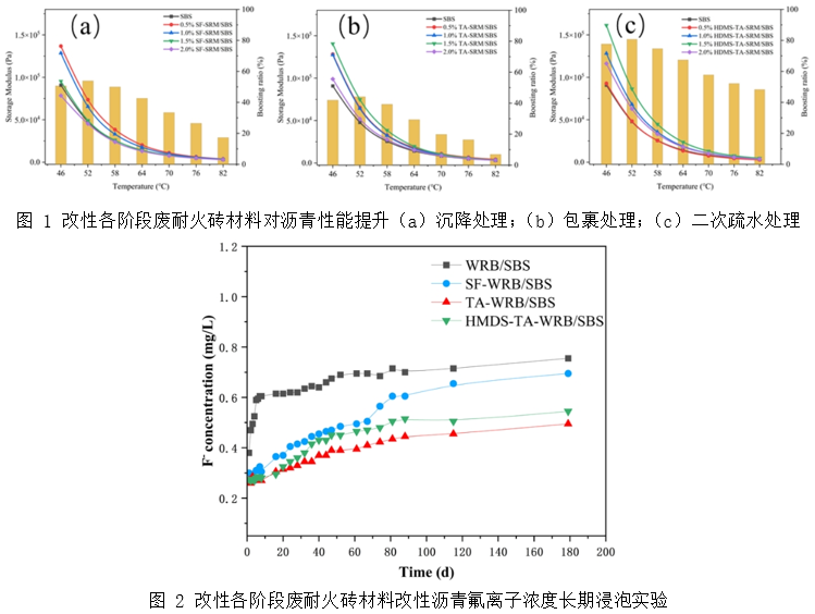 本研究目前已与相关企业进行了前期研究,并具备一定的研究基础。在前期研究中,使用废耐火砖材料改性剂改性的沥青粘弹性能在46℃时提升50%以上,并在半年的长期浸泡下对内部的氟化物表现出极强的封锁能力,具有相当高的强化能力和稳定性,并且后期还会基于本研究进行相关测试,使其在实际工程中发挥相应作用。