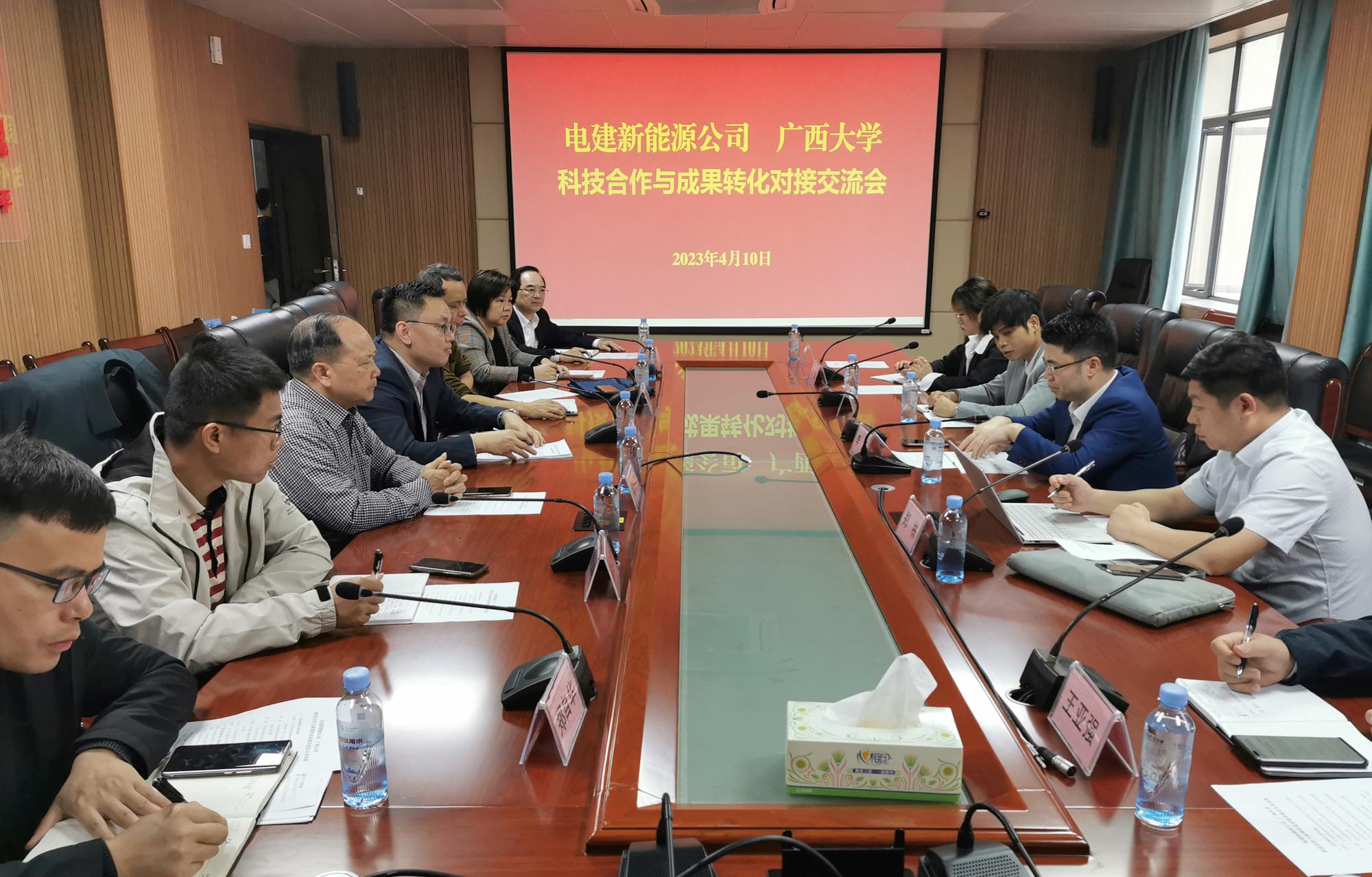 4月10日,为贯彻落实习近平总书记到广西视察工作时的重要指示精神,加快创新型来宾市建设,促进重大成果和重大科技项目在来宾市转化与实施,推动来宾市与我校产学研融合发展,中电建新能源集团股份有限公司南方分公司王梓任副总经理领队一行6人来访我校,举行科技合作与成果转化对接交流座谈会。会议由科研院成果与合作处秦祖赠副处长主持。
