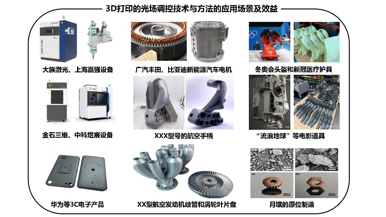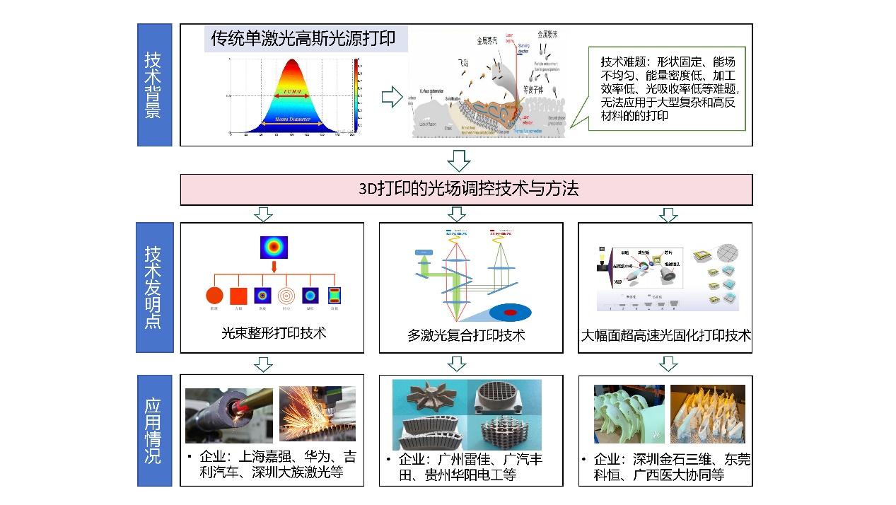 3D打印是国家战略和国际竞争的前沿核心技术。然而,受限于传统圆形高斯光源,3D打印存在制品精度低、能量利用率低和生产效率低等缺点,无法满足大型复杂零部件高效率、高精度、多功能的需求,严重限制3D打印的发展和应用。为此,本项目从光学理论、激光和材料相互作用机理出发,首创发明了光束整形、光束复合和多激光协作的新方法,利用一直被国内外3D打印行业忽视的激光单色性和相干性,解决了光场调控的关键技术难题,为3D打印提高效率和质量提供了一条全新的发展技术路线